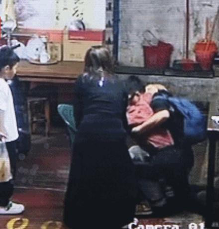 监控视频显示,中山市逢源商业街地下停车场保安李叔坐在桌边吃饭,起身的时候,突然站立不稳,身体抽搐,随后整个人趴着瘫倒在地上。路过的一家三口发现情况后,身着黑衣的男子直接将李叔搀扶到椅子上。随后多位市民陆续加入救援。其中,一名身着粉色T恤的女子给他递水,并指引救护人员到达现场。